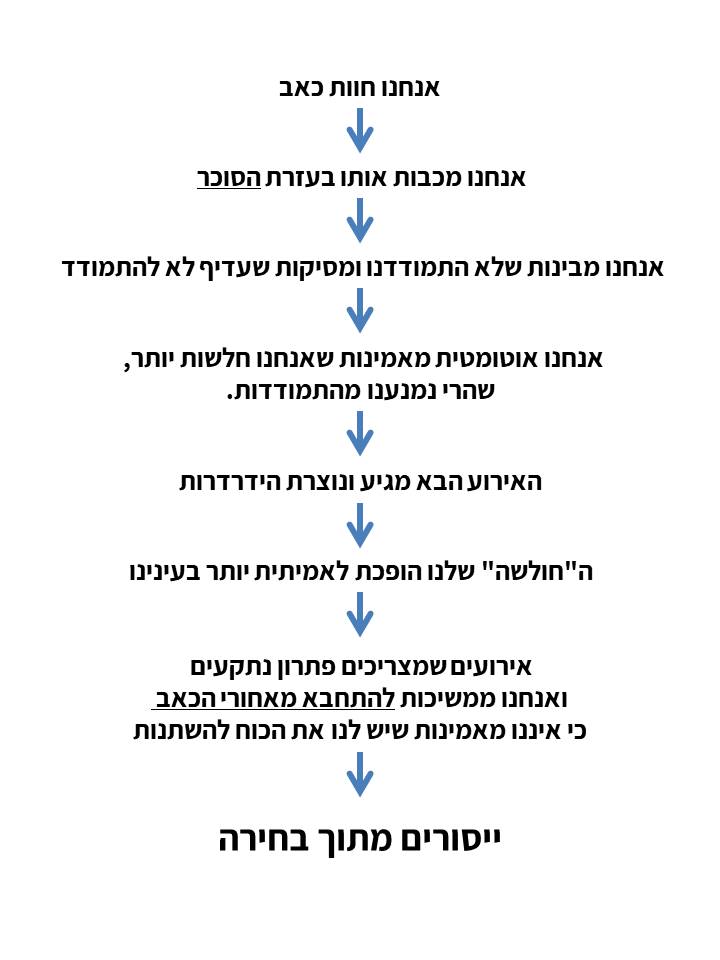 כשהפחדים והאמונות האלה תופסים אצלינו מקום בעקבות אירוע בחיים שכביכול "מוכיח" את נכונותם, נוצרים ייסורים: משיכה ארוכה של הכאב מהעבר- אל ההווה.